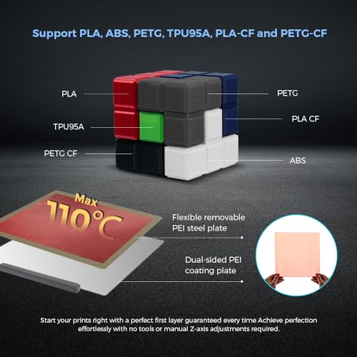 🔥【Robuste Konstruktion für überragende Qualität】Offener 3D-Drucker, geeignet für den Einsatz in offenen und gut belüfteten Umgebungen. Flexible herausnehmbare PEI-Stahlplatte unterstützt PLA/PETG/TPU (0,4 mm Düse) und PLA-CF/PETG-CF (0,6 mm Düse).