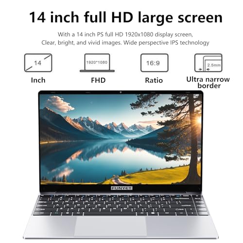 【Schlankes und leichtes Laptop】 Der FUNYET PC-Laptop wiegt ungeachtet 1,4 kg, die Produktabmessungen betragen 32,2 x 21 x 2,1 cm, ausgestattet mit einem 14,1 Steuer großen Bildschirm, der Computerbildschirm kann um 180 Maß gedreht werden und hat eine volle Zersplitterung von 1920 x 1080 -Erklärung-IPS-Displayauflösung, ein großer und schlanker Bildschirm, der unbegrenzte Anzeige ermöglicht. Sie werden ein beeindruckendes Erlebnis haben, kombiniert mit lebendigen Farben und detaillierten Bildern.