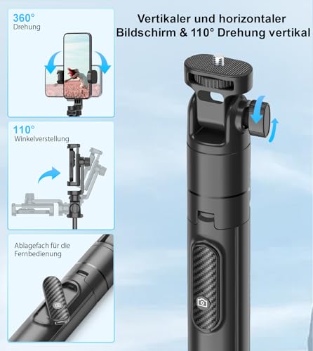 360° Drehbare Handyhalterung Stativ :Der selfie stick für iphone unterstützt 360° horizontale Rotation und 110° vertikale Rotation. Sie können frei zwischen Hoch- und Querformat umsetzen und den perfekten Winkel für Ihre Aufnahmen finden. Die verstellbare Telefonhalterung eignet sich für eine breite Palette von Smartphones Größe von 4“-7“.Handyhalterung mit kaltem Schuhschlitz zur Befestigung von Mikrofon und Selfie-Licht