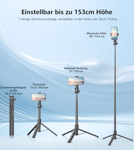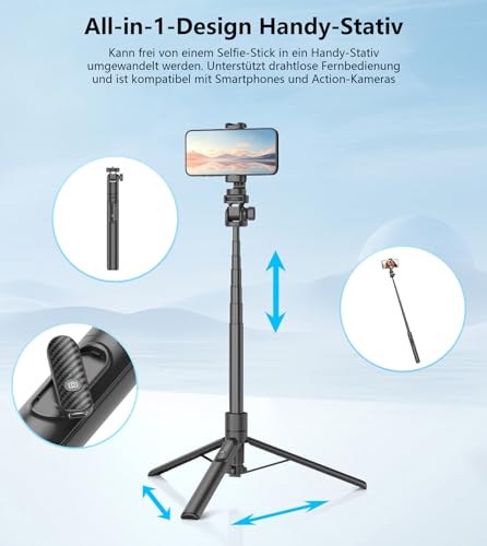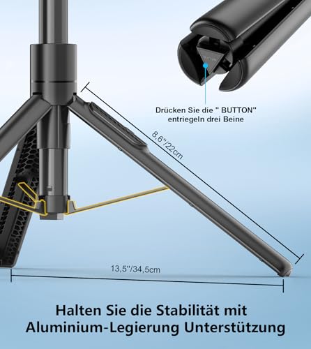 Größere und verstärkte Stativbasis : Das Telefon Stativ halten gute Stabilität mit Anti-Rutsch-Pad-Design an der Unterseite der Stativbeine.Ein Knopf entriegeln Design, Sie nunmehr einen einfachen Fingerdruck, der Selfie-Stick verwandelt sich mühelos in ein stabiles Stativ stehen. Der Selfie-Stick mit Aluminiumlegierung Material wird für längere Nutzung dauern.