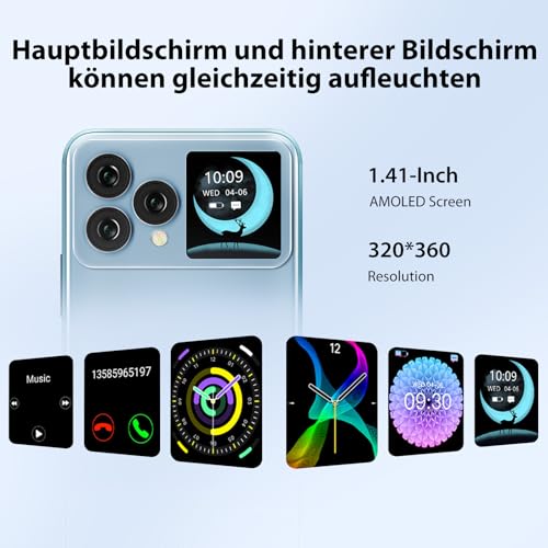 【Neues Handy mit Rückbildschirm im Jahr 2024】Dieses Smartphone verfügt über ein einzigartiges Design mit einem 1,41-Zoll-Rückbildschirm. Sie können Fotos machen, Musik hören, die Uhrzeit und Benachrichtigungen direkt auf dem sekundären Bildschirm überprüfen, ohne ein Passwort einzugeben, was Ihnen ein bequemes und cooles Erlebnis bietet. Es ist das neue trendige Handy im Jahr 2024.