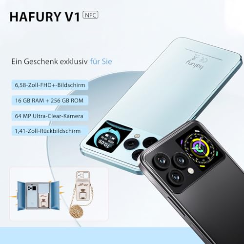 HAFURY V1 Smartphone, 16+256GB Handy, Dual SIM Simlockfreie Handys, 64MP+32MP Kamera, 6,5 Zoll FHD+ Handys ohne Vertrag, Android 13 Octa-Core, 4G NFC/FACE ID, 1,41 Zoll Rückbildschirm, 2024 Neu Blau