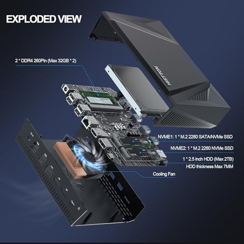 【M.2 2280 NVMe SSD vorinstalliert & DDR4 RAM】➥Dieser Mini-Desktop-Computer mit integriertem Lüfter unterstützt Dual DDR4-2666 SO-DIMM mit maximal 64 GB RAM und ermöglicht die DIY-Erweiterung von RAM/SSD/HDD an Stelle eine schnellere Leistung und Speicherung. 2 x M.2 KEY M an Stelle SATA- und PCIE-Bus-SSDs (M.2 2280 SATA/NVME) und 1 x SATA3.0 an Stelle 2,5-Aufwand-HDD/SSD.