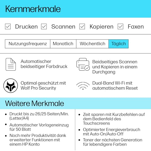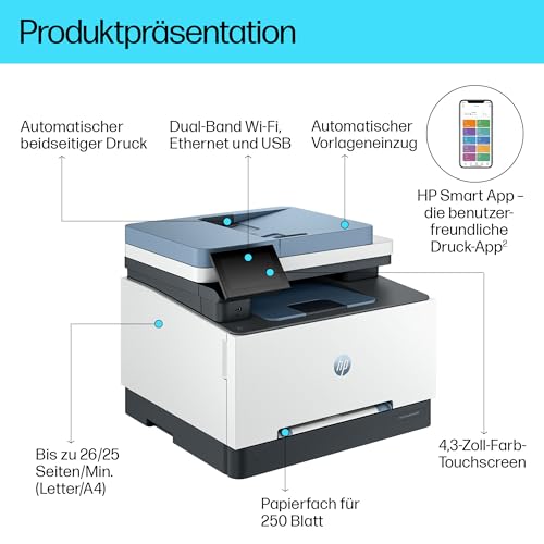Druckgeschwindigkeit bis zu 26/25 S./Min. (alphabetisches Zeichen/A4)); 250-Blatt-Papierfach mit Mehrzweck-Einzelblatteinzug; Anschlüsse: Dual-Band Wi-Fi, Wi-Fi Direct, High-Speed USB, Ethernet