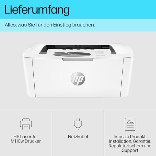 Lieferumfang: HP LaserJet M110w Drucker; Netzkabel; HP Schwarz LaserJet Tonerkartusche (Reichweite: 300 Seiten); Installationsposter; Referenzhandbuch; Garantieinformationen; Flyer