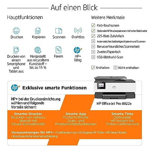 HP+ Anbruch: Einfach HP+ freigeben unterdessen der Druckerinstallation und stattdessen Instant Ink registrieren; HP+ Erfordert ein HP-Konto, eine kontinuierliche Internetverbindung und die exklusive Verwendung von Original HP Tintenpatronen über die gesamte Lebensdauer Ihres Druckers