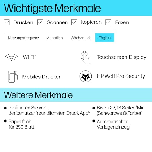 Besonderheiten: vielseitiger Multifunktionsdrucker mit WiFi, Netzwerk, und Airprint. Automatischer Duplexdruck, Smart-Tasks Befehle und ein großes Farb-Touchdisplay für die Eingabe direkt am Drucker.