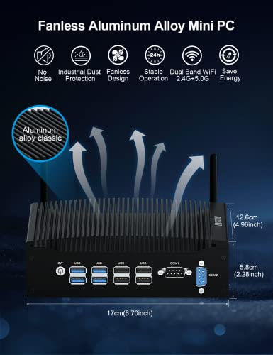 【Kleine Größe und mehrere Funktionen】 Die Größe des lüfterlosen Industrail-PCs:17cm(6.70inch)*12.6cm(4.96inch)*5.8cm(2.28inch), net weight 1.1kg(2.42lb)mit VESA-Halterung, Montagehalterung und Wandmontage. Der lüfterlose i5 Windows 10 Pro Mini-PC ist kompakt, hilft Platz zu sparen und ist leicht zu transportieren, obwohl er kein dickes Computergehäuse hat. Unterstützt RAID0/RAID1,RTC,Wake On Lan,Auto Power On,PXE.