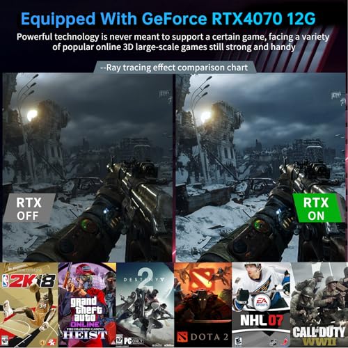 [HD Four-Display] Mini-PC mit GeForce RTX4070 12G GDDR6X diskrete Grafikkarte ausgestattet, unterstützt Ray Tracing und AI-Kerne. einfach 4 Monitore anschließen, 1 x HDMI und 3 x DP1.4 Ports (sämtliche verstreben 8K@60Hz Display), kann es Ihnen eine erstklassige TV-Erlebnis und realistische Bildqualität, für Ihre visuelle Home-Entertainment, Video-Streaming, Web-Browsing, Arbeits-Design und 3D-Spiele bearbeiten eine enorm glatte Erfahrung.