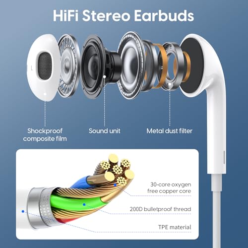 【Bequem und langlebig】 Die kabelgebundenen Ohrhörer haben ein ergonomisches Design, das sich effektiv und perfekt an die Ohren anpasst, ohne herunterzufallen, bequem, gefestigt und einfach zu abstützen. Das Kopfhörerkabel besteht aus weichem und elastischem TPE-Material, das verschleißfester und korrosionsbeständiger ist.