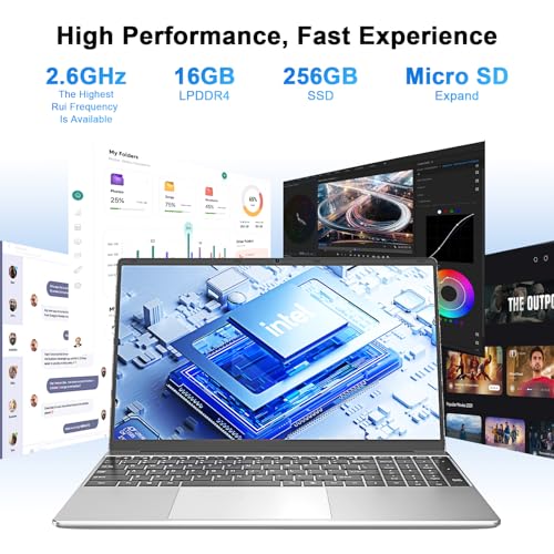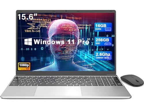 Laptop 15,6 Zoll FHD-Display, Win 11 Pro, 16 GB RAM 256 GB SSD, Notebook Computer 2,6 GHz Celeron, 1920*1080 IPS, 2,4G/5G WiFi, Gaming Laptop Mini HDMI, Bluetooth 5.0, PC Laptop mit Maus (Silber)
