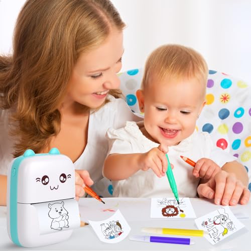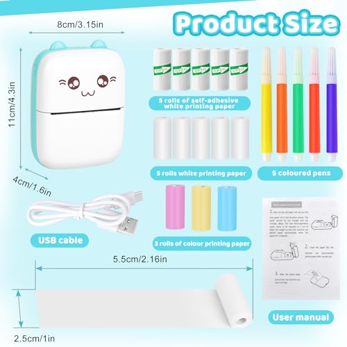 Lieferumfang: 1 x Taschendrucker; 5 Rollen weißes selbstklebendes Thermopapier, 5 Rollen weißes Thermopapier; 3 Rollen Thermopapier in Farbe; 5 Farbstifte; 1 x USB-Kabel, 1 x Bedienungsanleitung (evtl. nicht in deutscher Sprache). Ideales Geschenk für Kinder, Familie und Freunde!