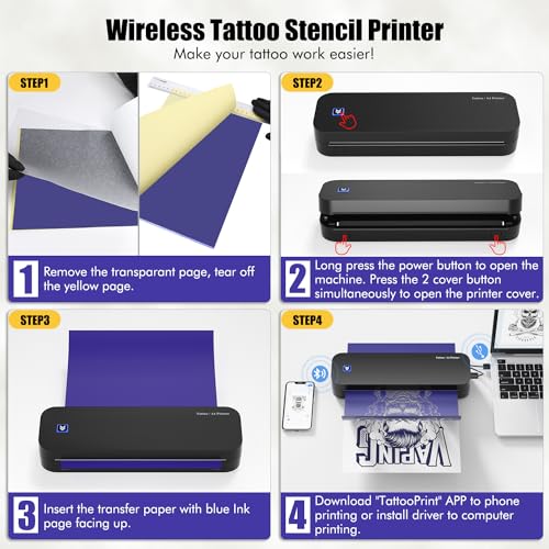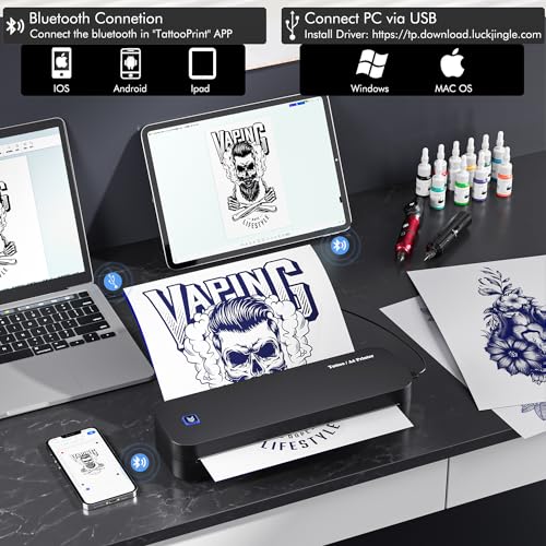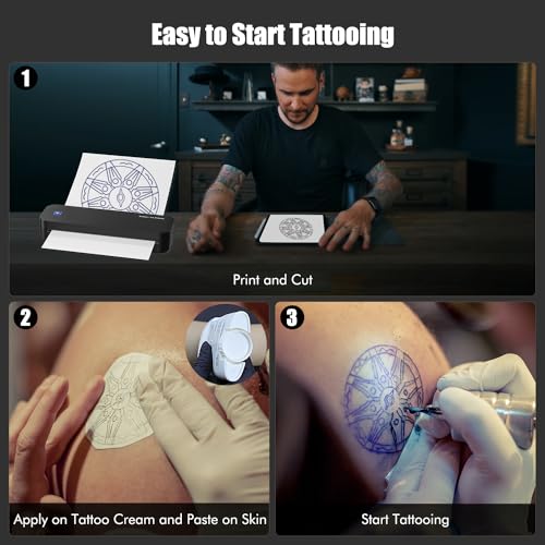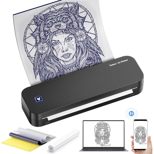 【Hohe Kompatibilität】Der tattoo drucker ist mit iPhone, Android Phone, iPad und Tablet über Bluetooth kompatibel. USB-Anschluss unterstützt Laptops und Desktop-Computer, kompatibel mit Windows, MacOS. Darüber hinaus, wenn PC-Edition, kann es als A4-Drucker verwendet werden, unterstützt A4-Thermopapierdruck.