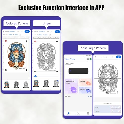 【Leistungsstarke App】Unsere „TattooPrint“ App ermöglicht das Drucken mit einem Klick, einfach und effizient. Die „TattooPrint“ APP ermöglicht es Ihnen, Schablonenbilder einfach zu umschreiben, hinzuzufügen, anzupassen und auszugeben. Über die App-Steuerung können Sie verschiedene Tattoo-Bilder ausdrucken. Außerdem kann die App bunte Motive mit einem einzigen Klick in schwarz-weiße Strichzeichnungen verändern. Eine Bildschneidefunktion für große Tattoo-Schablonen ist ebenfalls in Bereitschaft.