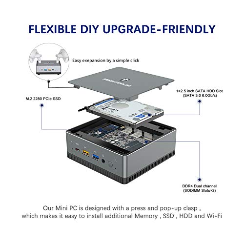 銆怱ehr gro脽e Kapazit盲t銆� Der DMAF5 Desktop PC ausgestattet via M.2 2280 256GB SATA SSD außerdem DDR4 8 GB 脳 2 Zweikanal (SODIMM-Steckpl盲tze 脳 2) RAM. Au脽erdem kann der Speicher 眉ber 2.5 inch SATA HDD oder SSD(SATA 3.0 6.0Gb/s) erweitert werden. Ob Datei眉bertragung oder Videowiedergabe, es ist schnell zu l枚sen!