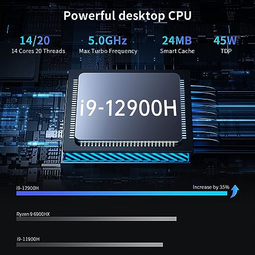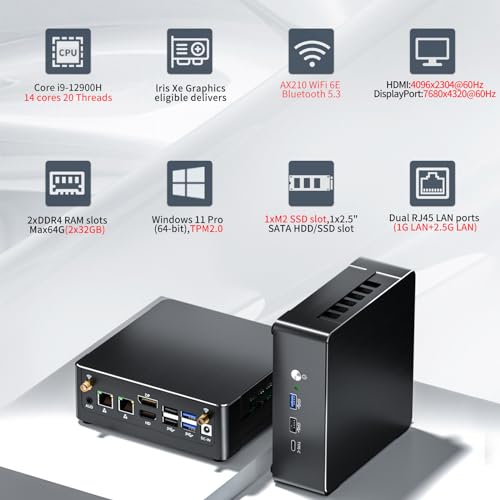 [Hohe Leistung] Mini-PC ausgestattet mit Core i9-12900H Prozessor, 14 Kerne 20 Threads, 24M smart Cache, Basisfrequenz: 3.8GHz, max 5.0GHz. „7nm SuperFin“ mit verbessertem Ausguss, Dieser Mini-Computer ist mit Windows 11 Pro (64bit) OS vorinstalliert, Eingebautes Intel AX210 WiFi6E, Bluetooth 5.3, Im Abmachung zu wifi6 wurde das 6GHz Band für bessere Anti-Interferenz-Besorgnis und schnellere Übertragungsrate hinzugefügt. Mini-PC ist ideal für wie Unterhaltung, Design, Büro, Industrie, etc.