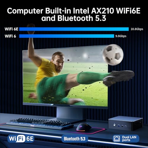 [Schnittstellenspezifikationen] Mini PC ist ausgestattet mit 3xUSB3.2, 3xUSB2.0, 1xHDMI2.1, 1xDP1.4A, 1xUSB-C, 1xAuido(3.5mm), 2xRJ-45 Giga LAN port(1 x 2.5G LAN, 1 x 1G LAN). Mini PC ist mit 1 x 2.5Gbps LAN Port ausgestattet, es erweitert seine Funktionen und verbessert die Leistung des Computers zu einem großen Abschnitt und ermöglichen Ihnen, mehr Netzwerke wie Software-Router, Firewalls, NAT usw. zu verwenden. Reichhaltige Ports sind auch mit Ihren verschiedenen Bürogeräten kompatibel.