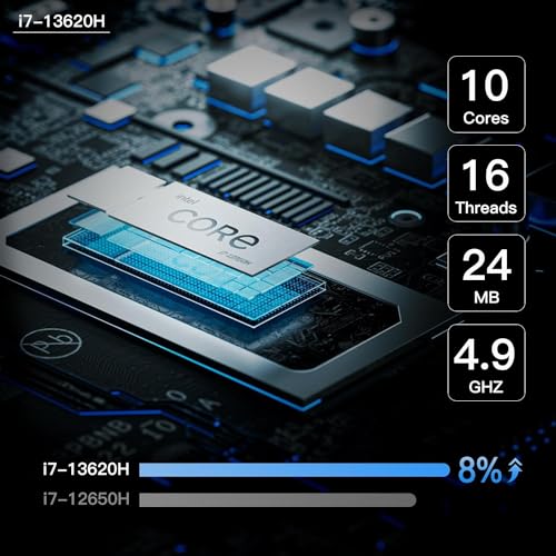 【Intel Core i7 der 13. Generation】 Venus NPB6 Mini-PC ist mit einem Intel Core i7-13620H Prozessor, 10 Kerne 16 Drähte, 24 MB Cache, bis zu 4,9 GHz, mit Intel Iris Xe Graphics, bringt leistungsstarke Leistung und ultimative flüssige Erfahrung für Spiel und Arbeit.