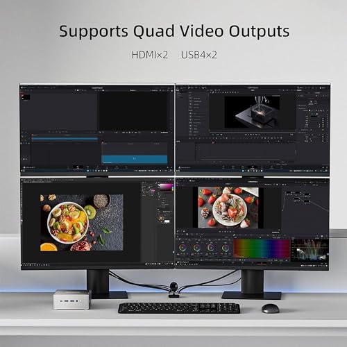 【Unterstützt Quad-Videoausgänge】Der Mini-PC wird mit einer 4K@60Hz Ultra-High-Distinktion-Grafikkarte (Intel Iris Xe) geliefert, um 4K@60Hz High-Distinktion-Videowiedergabe zu stützen und ein hochwertiges visuelles Erlebnis zu genießen. 2 x HDMI-Anschlüsse und 2 x USB4-Anschlüsse stützen 4K-Vier-Bildschirm-Ausgang, die Werk auf mehreren Monitoren gleichzeitig bietet Ihnen ein außergewöhnliches Kreativerlebnis.