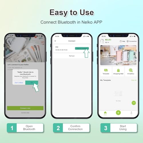【Einfach zu verwenden】NELKO-Etikettendrucker, kompatibel mit iOS- und Android-Smartphones über Bluetooth-Verbindung. Schritt 1: Laden Sie die APP „Nelko“ von Google Play oder App Store herunter. Schritt 2: Installieren Sie die Papierrolle. Schritt 3: Verbinden Sie das P21 über Bluetooth mit der APP. Schritt 4: Wählen Sie eine Schnellvorlage und beginnen Sie mit dem Drucken. Dieser Etikettendrucker mit Band-APP enthält mehr als 90 Schriftarten, 10+ Sprachen und 450+ Materialien. Hinweis: Dieser Etikettendrucker funktioniert nicht mit Computern