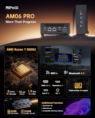 【Mehr Schnittstellen, Bequemer】 Der NiPoGi AM06 PRO Mini PC ist mit 2 x RJ45-Gigabit-Ethernet-Port, 1x DP, 1x HDMI 2.0, 2x USB 3.0, 2x USB 2.0, 1x Audioeingang/-ausgang, 1 x TYPE-C ausgestattet. Machen Sie Ihr Büro und andere Nutzungen barrierefrei, katalysieren Sie die Verwendung mehrerer Geräte und als Server, Überwachungsgeräte, Bürogeräte, Monitore, Projektoren und andere Multimediageräte und gewerbliche Geräte. Wake On LAN, RTC Wake und Auto Power On werden ebenfalls unterstützt.