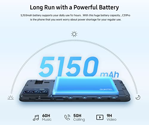 ★【Lange Ablaufzeit dank leistungsstarkem wiederaufladbare Batterie:】Der 5.150-mAh-wiederaufladbare Batterie unterstützt Sie stundenlang bei Ihrer täglichen Aufsatz. Mit dieser enormen Akkukapazität ist das C31 PRO das Handy, bei dem Sie sich keine Sorgen um Stromengpässe bei intensiver Nutzung machen müssen (50 Stunden Telefonieren, 9 Stunden Video, 60 Stunden Musik).