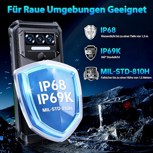【IP68/IP69K & MIL-STD-810H】 Das OUKITEL WP38 Outdoor Smartphone Ohne Vereinbarung ist ein robustes Outdoor-Militärtelefon mit hervorragender IP68/IP69K Wasserdichtigkeit, Staubdichtigkeit und Stoßfestigkeit. Es ist bis zu 1,5 Meter Hölle für bis zu 30 Minuten wasserdicht, sturzsicher bis zu einer Höhe von 1,5 Metern und kann in Temperaturen von -20°C bis 55°C betrieben werden. Entwickelt, um mühelos rauen Umgebungen standzuhalten, ist das WP38 die ideale Kür für Glücksjäger, Fernfahrer, Outdoor-Arbeiter usw.
