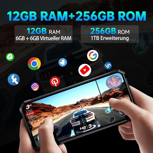 【12GB + 256GB & Octa-Core CPU】 Das robuste OUKITEL WP38 Outdoor handy ist mit massiven 12GB RAM (6GB + 6GB virtuell) und 256GB internem Speicher ausgestattet, der bis zu 1TB erweiterbar ist. Dies gewährleistet ein reibungsloses Multitasking selbst mit speicherintensiven Anwendungen und bietet massenweise Platz für tausende von Fotos, Videos und mehr. Angetrieben von einem effizienten Octa-Core MTK8788 Prozessor, beseitigt das WP38 Verzögerungen, Abstürze und Überhitzungsprobleme.