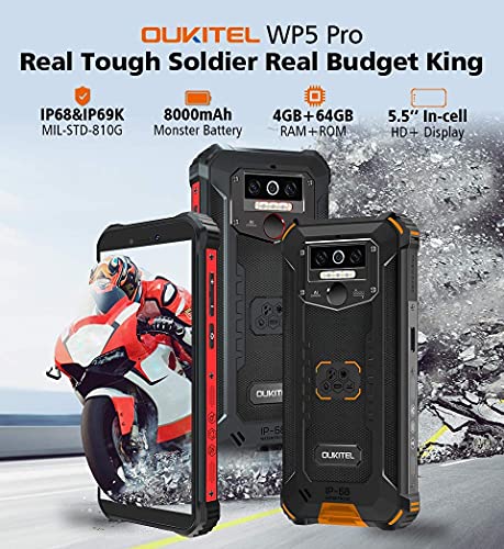 OUKITEL WP5 PRO 4G Outdoor Smartphone ohne Vertrag, 8000mAh Batterie 4 LED Blitzlicht, Android 10 Robustes Handy IP68, Helio A25 4GB + 64GB, 13MP + 2MP + 2MP, Gesichtserkennung, GPS DUAL SIM Orange