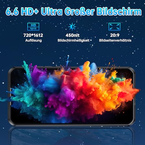 6,6 Aufschlag HD+ Bildschirm: Das OUKITEL WP52 5G Outdoor Smartphone verfügt über einen 6,6-Aufschlag-HD+-kratzfesten Bildschirm mit einer Helligkeit von 450 Nits und einer Abbau von 1612 x 720. Darüber hinaus bietet dieses handy ohne vertrag eine hervorragende Farbperformance und sorgt für ein immersives Seherlebnis, egal ob Sie spielen oder Filme ansehen. Es vereint Stil, Business, Robustheit und Technologie in einem Triebwerk