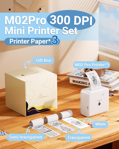 Phomemo M02 Pro Mini Drucker für Smartphone, Aufkleber Drucker 300 DPI Mini Fotodrucker mit 3 Papierrollen, Tragbarer Thermodrucker Taschendrucker für Studiennotizen, Fotos, Etiketten