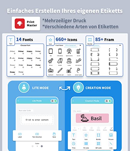 MEHRFACHE KREATIVE FUNKTIONEN & BEQUEME LABELVORLAGEN: Die Smart-App Print Master umfasst 1238 Symbole, 183 Rahmen und 10 Schriftarten für Bequemlichkeit und Zeitersparnis. Erstellen Sie problemlos Aufkleberetiketten ganz der App in verschiedenen Designs, einschließlich Icons, Text, Tabellen, Symbolen, Logos, Barcodes, QR-Codes, Bildern, Zeit, Einfügen von Excel, Scannen, OCR – es macht Spaß und ist mühelos