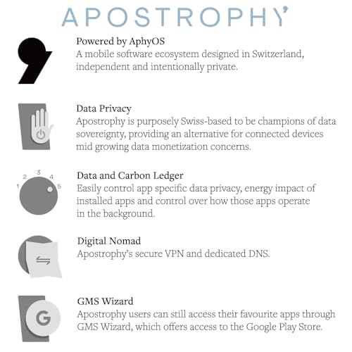 POWERED BY APOSTROPHY OS: Bietet eine Vielzahl von Funktionen, die sich darauf konzentrieren, Sie zu befähigen und nicht auszunutzen. Kontrollieren Sie, wie Sie Ihr mobiles Leben zu Ihren Bedingungen leben, ohne persönliche Daten für Unternehmensgewinne preiszugeben.