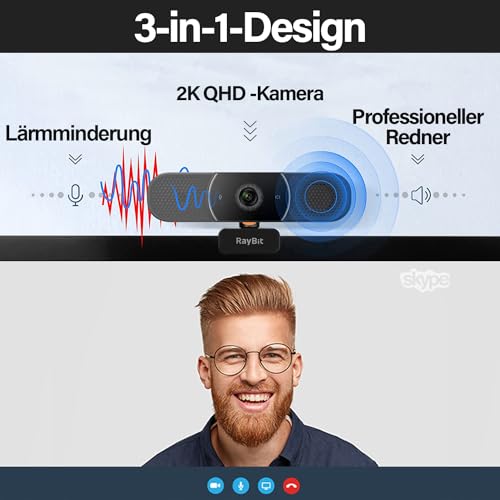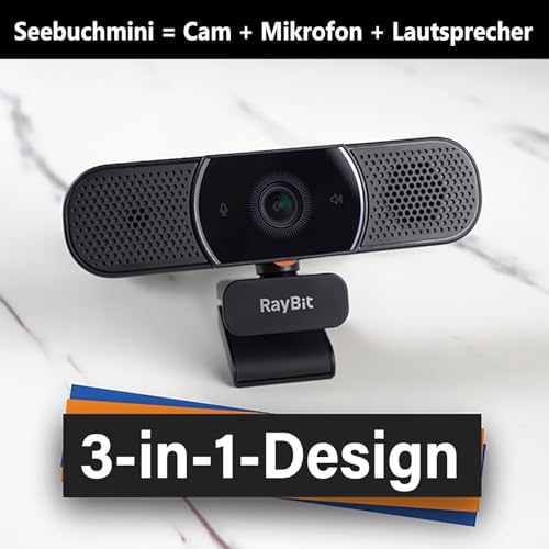 RayBit 3-in-1 Webcam – 2K HD Webcam mit Mikrofon, Lautsprecher und Abdeckungen, Klarer Stereo-Sound & Belichtungskorrektur & Autofokus, USB Web Kamera für Desktop Computer/PC/Laptop/Zoom/Skype/Teams