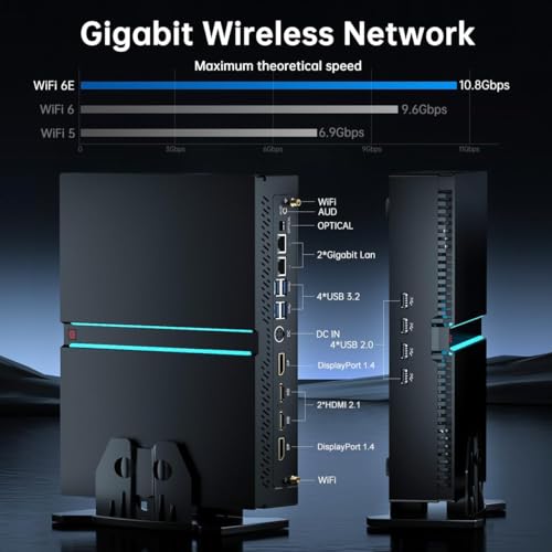 【Rich Ports】 Der Mini-Computer ist ausgestattet mit 4 x USB3.2, 4 x USB2.0, 2 x HDMI Port, 2 x DP Ports, 2xRJ-45 Gigabit Netzwerk Ethernet, 1 x Fiber Optic PORT, 1 x Audio in/out. Dieser Computer unterstützt Multi-Screen-Displays (2*DisplayPort und 2*HDMI können gleichzeitig Videosignale ausgeben). Eingebautes AX210-Modul, unterstützt Wi-Fi 6E drahtloses Gigabit-Ethernet und Bluetooth 5.3. Dual LAN und Optical feilbieten Ihnen mehr Einsatzmöglichkeiten.