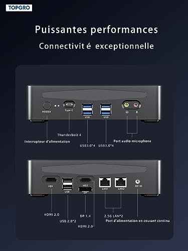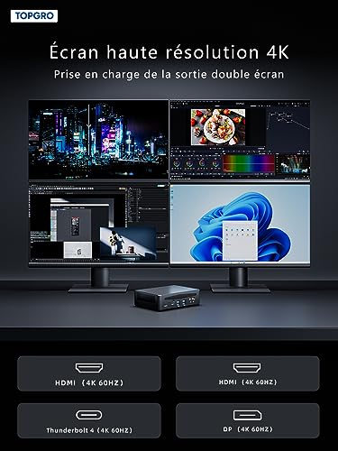 ▶【Vierfache 4K-Anzeige】Mit Thunderbolt 4×1, HDMI 2.0×2 und DP 1.4×1 unterstützt der Mini-PC gleichzeitig vier Bildschirme, was die Produktivität arg steigert. Er ist kompatibel mit einer Vielfältigkeit von Anzeigegeräten denn Monitoren, Fernsehern und Projektoren. Darüber hinaus unterstützt der ultraschnelle Thunderbolt 4-Anschluss PD-Laden und Datenübertragungsraten von bis zu 40 Gbps, für eine reibungslose Verbindung mit Peripheriegeräten.