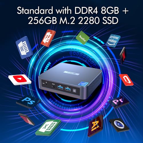 【8GB DDR4 und 256GB SSD, Unterstützung für Aufrüstung auf 64GB RAM und 2TB SSD.】 Der Trycoo WI-6 Mini-Schreibtischcomputer wird mit eingebautem Single-Channel 8GB DDR4-RAM (max. 3200MHz) und 256GB M.2-SSD geliefert. Sie können die SSD gegen eine maximale Kapazität von 2TB M.2 2280 SSD (nicht enthalten) ergänzen, um den Speicherplatz zu erweitern. Dank der großen Kapazität können Sie zwischen mehr Anwendungen umwandeln und mehr Lieblingsdokumente oder -filme in See stechen.