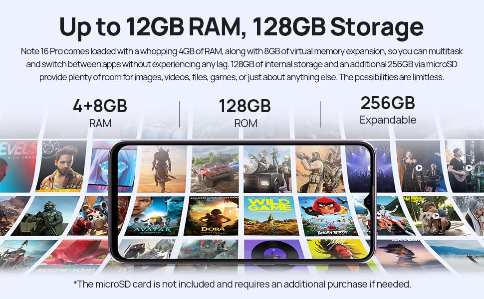★【Bis zu 12 GB RAM, 384 GB Speicher:】Note 16 Pro ist mit enormen 4 GB RAM ausgestattet, zusammen mit 8 GB virtueller Speichererweiterung, sodass Sie problemlos zwischen Apps ergänzen und Multitasking betreiben können, ohne Verzögerungen zu erleben. 128 GB interner Speicher und zusätzliche 256 GB über microSD bieten üppig Platz für Bilder, Videos, Dateien, Spiele oder nahezu alles andere. Die Möglichkeiten sind grenzenlos.