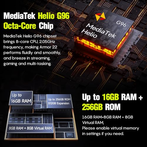 🟠【16GB + 256GB/512GB & Neueste Android 13】: Ulefone Armor 22 handy ohne vertrag mit neueste Android 13 OS und MediaTek Helio G96 Octa Core 2.05GHz völlig neuen Gaming-Prozessor, ist noch persönlicher, mit schnellerer Verarbeitung, weniger Verzögerungen. Verfügt über bis zu 16GB RAM(8GB RAM + 8GB virtuellen RAM) + 256GB ROM + 512GB SD Erweiterung, das Herunterladen und Teilen zum Kinderspiel zu machen.