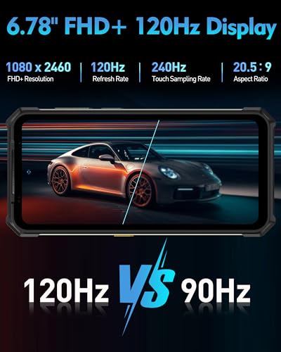 6,78 FHD+ 120Hz Bildschirm:Der 6,78-Ertrag-Bildschirm des Ulefone Armor 24 robustes handy besteht aus Corning Gorilla Glass und seine 2460 x 1080 Zerrüttung bietet ein erstklassiges visuelles Erlebnis. Die hohe Bildwiederholfrequenz von 120Hz in Kombination mit der 240Hz Touch-Abbildung ermöglicht flüssige Bewegungen und ein extrem reaktionsschnelles Gameplay.