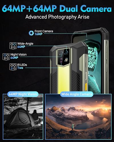 64MP Superkamera+64MP Nachtsichtkamera+16MP Frontkamera:Dieses unzerstörbare smartphone ist mit einer 64MP Hauptkamera, einer 64MP Nachtsichtkamera und einer 16MP Frontkamera ausgestattet, die verschiedene Aufnahmeanforderungen vollenden können. 2 IR-Blitze können Ihnen helfen, klare und zufriedenstellende Fotos in der Dunkelheit zu machen. Dieses wasserdichte handys unterstützt auch Unterwasseraufnahmen.