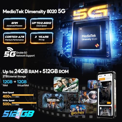 【5G MTK Dimensity 8020 & 24GB+512GB & WiFi 6 】 Ulefone Armor 26 Ultra 5G handy ohne vertrag mit MediaTek Dimensity 8020 Octa Core 2,6 GHz völlig neuen Gaming-Prozessor, erzielt eine Spitzen geschwindigkeit und Leistung. Ultraschnelle 5G mit Dual SIM verändert, wie Sie tätig sein und spielen. Wi-Fi 6 bis zu 3-fache Geschwindigkeit, breitere Signalabdeckung, stärkere Signaldurchdringung. Bis zu 24GB RAM(12GB RAM + 12GB virtuellen RAM) + 512GB ROM + 2TB SD Erweiterung, das Herunterladen und Teilen zum Kinderspiel zu machen.