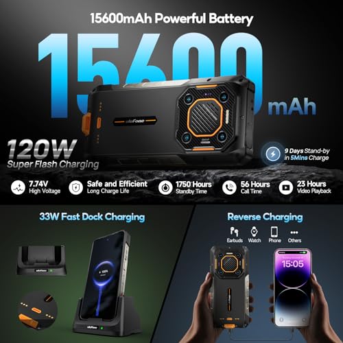 【15600mAh Speicherzelle + 120W Schnellladung + Powerbank Vergrößerung】: Ausgestattet mit der 15600mAh Speicherzelle, die Ulefone Armor 26 Ultra Outdoor handy eine Standby-Zeit für bis zu 540 Stunden, Telefongespräche 54 Stunden hat. Mit 120W Flash Aufladen und 50W kabellose Laden, können Sie innerhalb 10 Minuten auf 60% aufgeladen werden. Unterstützt die OTG-Vergrößerung, Sie können es als Powerbank verwenden, um andere Telefon Uhr Ohrhörer aufzuladen.