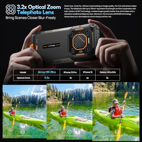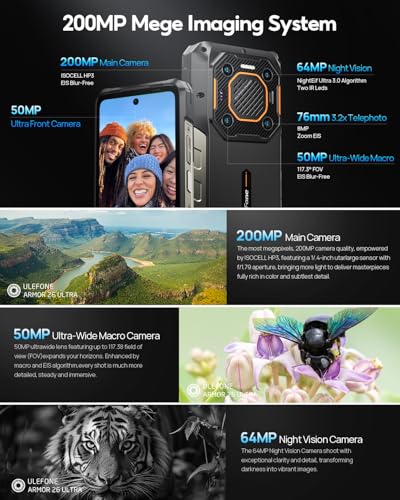 【200MP+64MP+50MP+8MP Raum-Scenario Quad-Kamerasystem】: Ulefone Armor 26 Ultra verfügt über ein Raum-Scenario Quad-Kamerasystem mit insgesamt 372MP: kombiniert eine SLR-Level HP3 200MP Hauptkamera, eine 117,3°50MP Ultra-Weitwinkelkamera, eine 64MP Nachtsichtkamera, ein 8MP 3,2-fach optisches Zoom-Teleobjektiv sowie eine 50MP Frontkamera. Darüber hinaus verhindert die ZOOM EIS-Technologie Erschütterungen während der Ultra-Telefotaufnahme und ermöglicht eine sofortige und stabile Bildaufnahme.