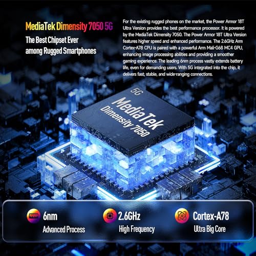 🚀【MediaTek Dimensity 7050 Dual 5G Android Phone + Android 13 OS】 Angetrieben vom MTK Dimensity 7050 erreicht Power Armor 18T zum ersten Mal in einem robusten Telefon Spitzengeschwindigkeit und Leistung. Die 2,6-GHz-Hochfrequenz-Arm-Cortex-A78-CPU wird mit einer leistungsstarken 1000-MHz-Arm-Mali-G68-GPU geliefert, die Datenverarbeitungs- und Bildverarbeitungsfähigkeiten der nächsten Schritt bei geringerem Abreibung bietet.