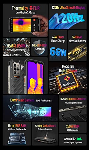 Ulefone Power Armor 19T Wärmebildkamera (Lepton 3.5) Outdoor Handy ohne Vertrag, 108MP Kamera, 12GB+256GB, 6.58“ 120Hz FHD+, IP68 Wasserdichtes Android 12 Smartphone DUAL SIM, Drahtloses Laden NFC