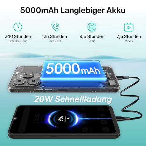 【5000mAh Stromspeicher+20W Schnellladung】UMIDIGI A15 Smartphone verfügt über einen 5000mAh Stromspeicher, um Sie 24/7 am Laufen zu halten. Das Stromspeicher-Optimierungssystem passt die Ladegeschwindigkeit automatisch an, um die Akkuleistung zu optimieren. Das Gaming-Handy ist mit einer 20W-Schnellladefunktion ausgestattet, die das Handy in kurzer Zeit aufladen kann! Es unterstützt den Super-Energiesparmodus und die OTG-Tabelle unterstützt das umgekehrte Laden und die Datenübertragung.