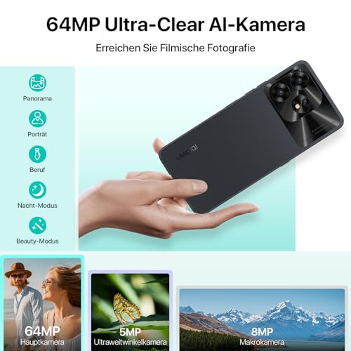 【64MP+16MP+8MP AI-Kamera】UMIDIGI A15 Android-Smartphone ist mit 64MP mit fortschrittlicher Bildverarbeitungstechnologie ausgestattet, kombiniert mit 5MP Makro-Kamera, um winzige Details in jeder komplexen Aufzug zu erfassen.8MP Ultra-Weitwinkel-Kamera mit Unterstützung für Panorama und Zeitraffer-Modi, so dass Sie schöne Fotos zu erfassen.16MP AI-Frontkamera nimmt Ihren schönen Zustand mehr natürlich.
