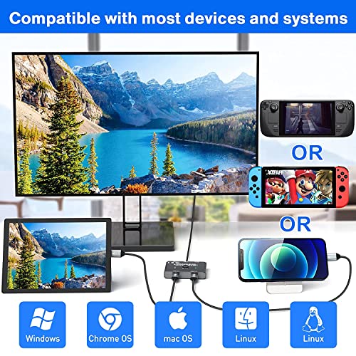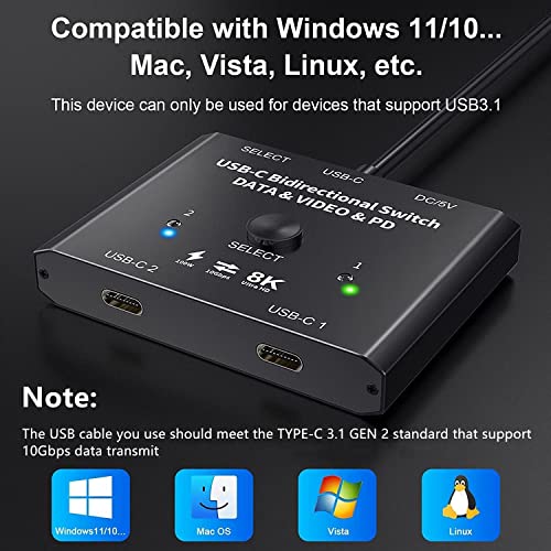 【Unterstützt PD-Laden】 Dieser USB-C Schalter mit PD 3.0-Ladefunktion, Nennleistung 100 W, Reichweite 87 W. Drücken Sie die Taste „Select“, um zwischen zwei Displays oder dem PC zu umsetzen. Hinweis: Verwenden Sie kein zu langes Kabel für die Verbindung zwischen dem Umschalter und Ihren Geräten, da es sonst flackert. (Kabellänge innerhalb von 60 cm ist am besten)