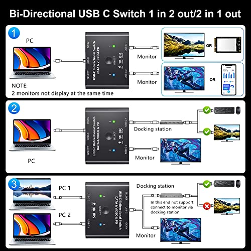 【Bidirektionaler 8K USB-C Switch】 USB-C Schalter mit zwei Eingängen und einem Ausgang, Verwendung für 2 Computereingänge, 1 Monitorausgang oder 1 Computereingang und 2 Monitorausgänge.